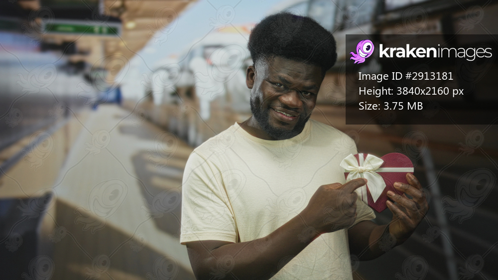 Man points finger to camera on cruise ship while smiling and holding a heart shaped gift box near chest; playful romance.