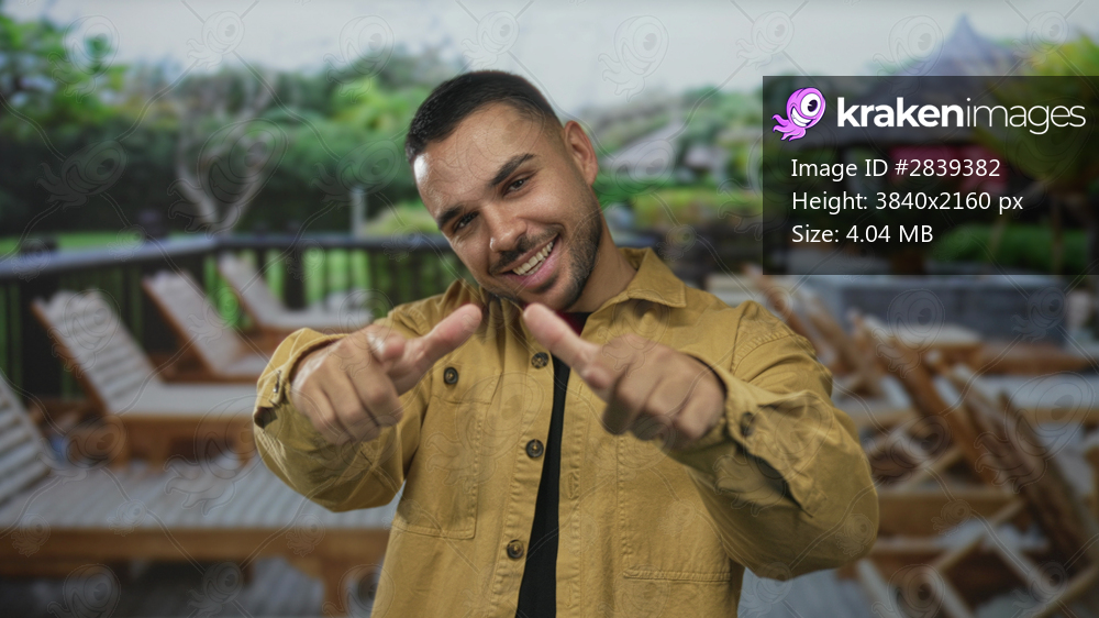 Man points finger to camera on hotel deck in front of building with lounge chairs and tropical foliage; enthusiasm confidence energy optimism.