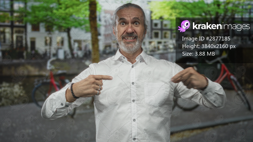 Man points finger to chest on amsterdam street by canal wearing white shirt and bracelets; confidence playfulness.