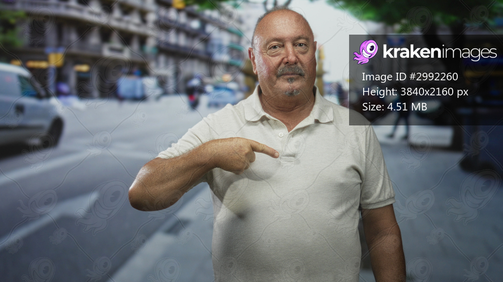 Man points finger to chest on busy city street near sidewalks, cars and storefronts while wearing a light polo shirt; self identity confidence.