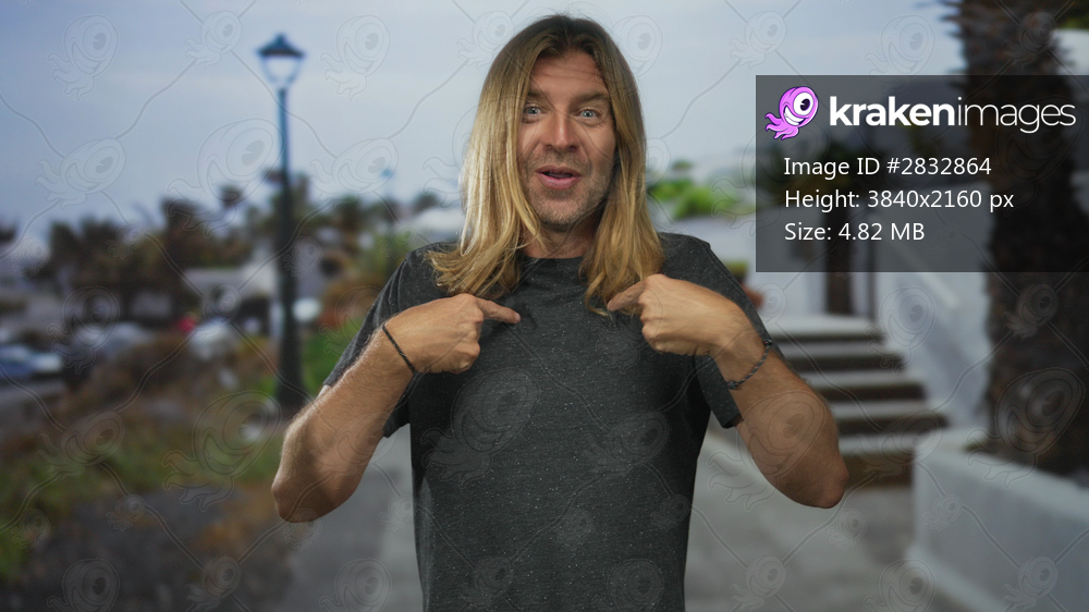 Man points finger to chest and smiles broadly on a sunny street walkway lined with palm trees; confidence.