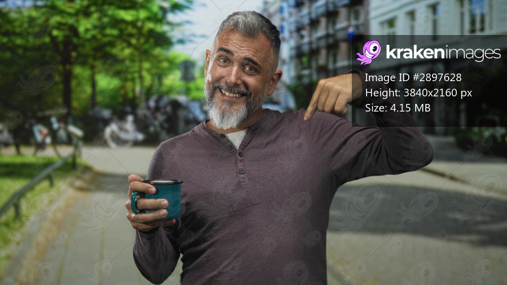 Man points finger to chest while holding mug on street near apartment building; confidence casual promotion.