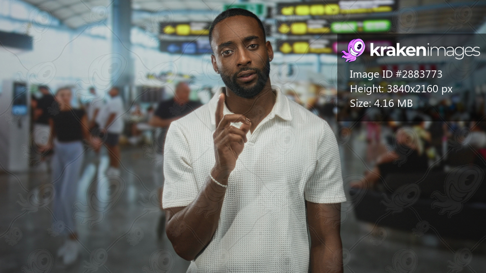 Man points finger to departures display in a busy airport terminal while standing near gates; travel anticipation.