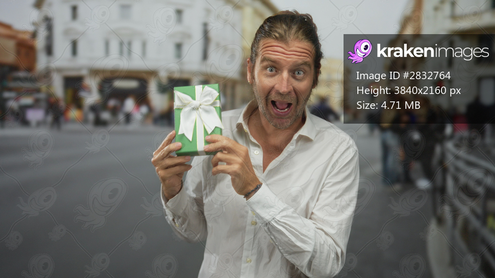 Man points finger to green gift with white bow on busy street while cheerfully smiling; surprise joy.