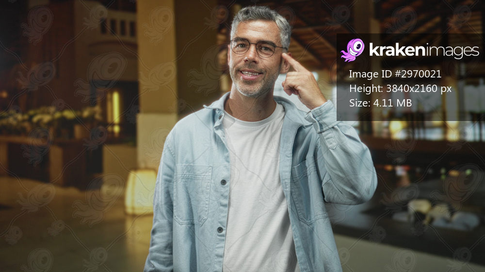 Man points finger to head wearing light blue shirt and glasses in building lobby with subtle smile and casual pose; thoughtful idea.