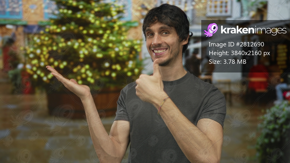 Man points finger to large decorated glowing christmas tree on busy city street during winter market; holiday joy.