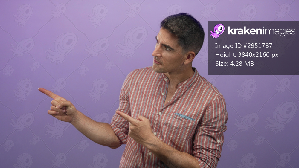 Man points finger to left in studio with purple backdrop, wearing striped shirt and leaning forward; surprise attention.