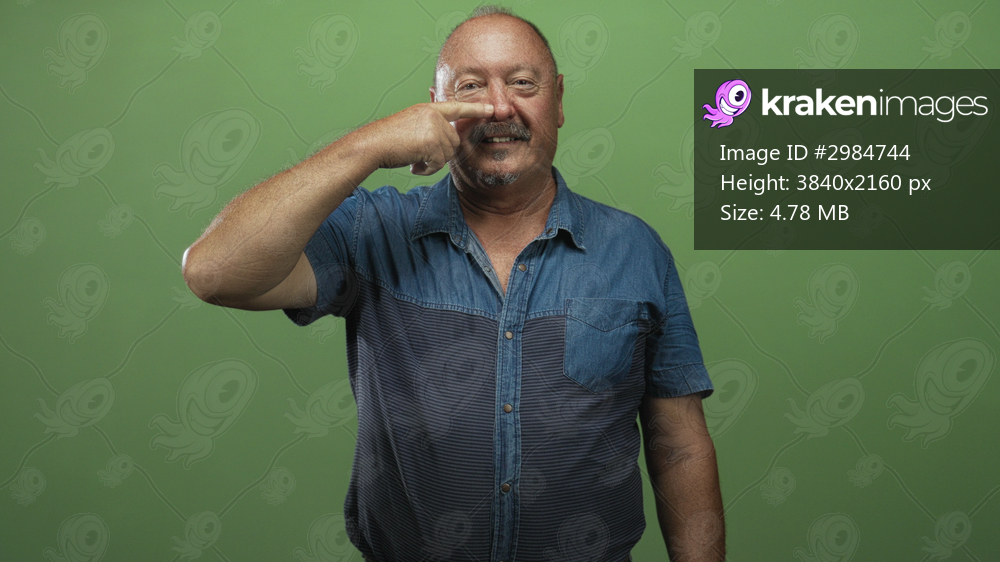 Man points finger to nose in studio, smiling slightly with exposed forearm and denim shirt; playful mischief.