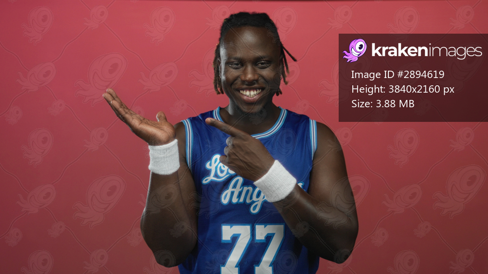 Man points finger to open palm in pink studio wearing blue basketball jersey and white wristbands; joy playfulness.