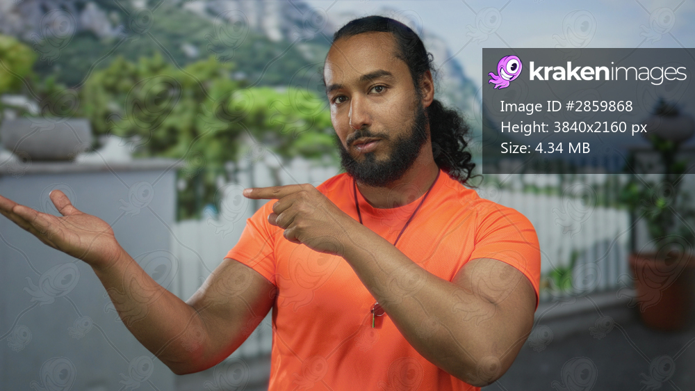 Man points finger to open palm on building terrace wearing a whistle necklace and orange tshirt; thoughtful reflection.