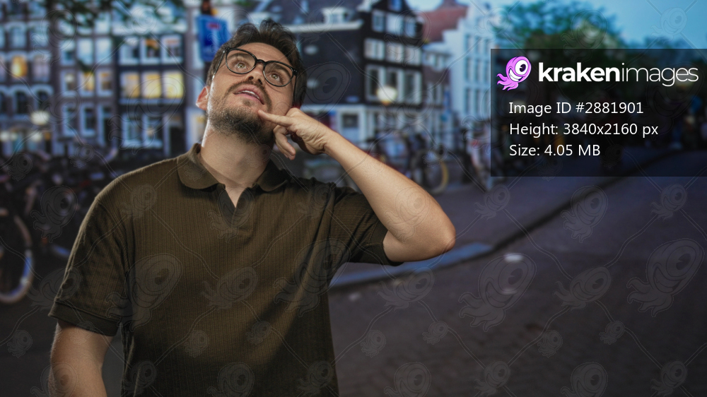Man points finger to palm on city street near parked bicycles and canal houses; quiet contemplation.