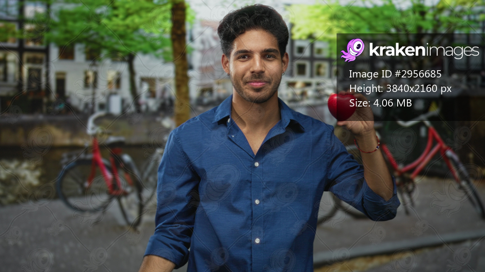 Man points finger to red heart held in his hand on a canal street with bicycles and riverside buildings; affection warmth.