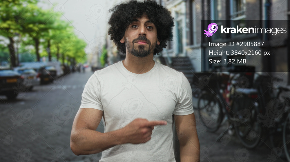 Man points finger to right on street showing bare finger and forearm, curly hair in white t shirt; curiosity.