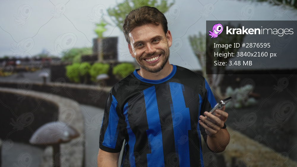 Man points finger to smartphone on a curved stone street with cacti and pathway behind him; casual digital connection joy.