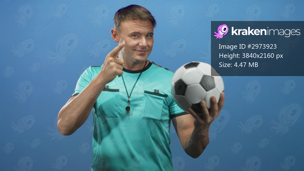 Man points finger to soccer ball with hand while holding ball and whistle visible in studio; confidence authority sport.