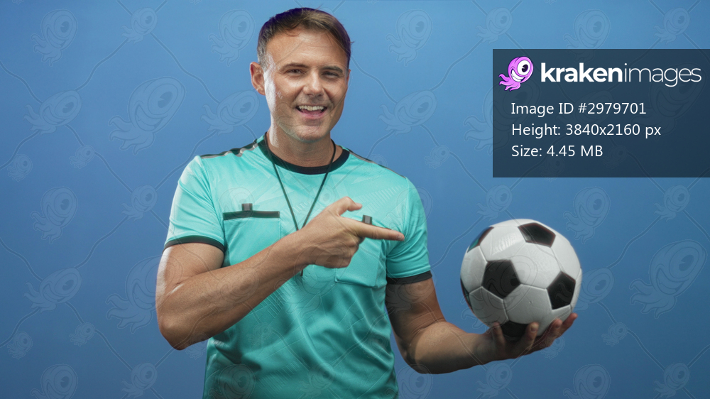 Man points finger to soccer ball with hand while holding ball and whistle visible in studio; confidence authority sport.