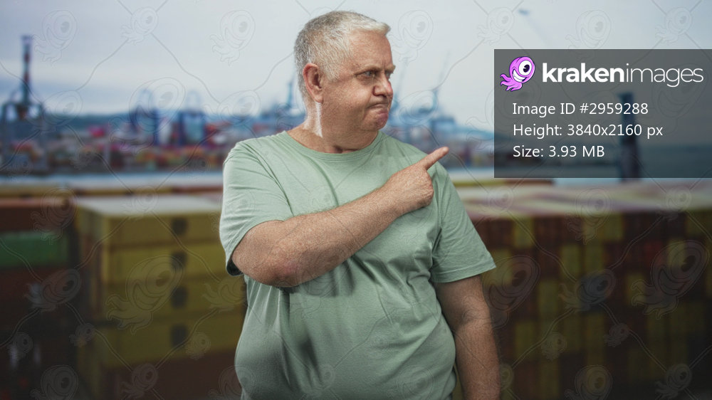 Man points finger to stacked shipping containers in a port building while looking upward with a pensive expression and relaxed posture; quiet contemplation. - Kraken Images