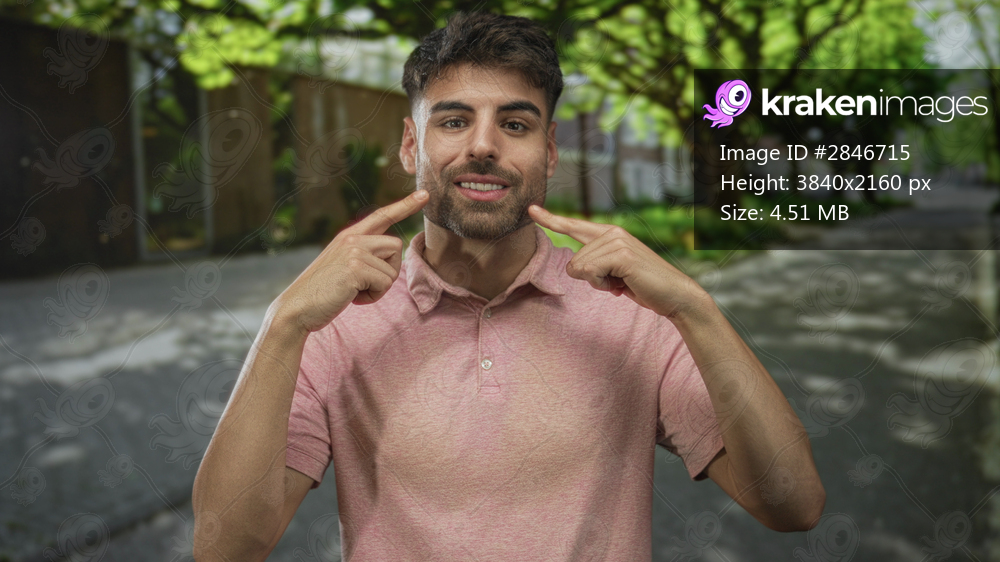 Man points finger to teeth in pink polo on sunlit city street with tree lined sidewalks; confidence.
