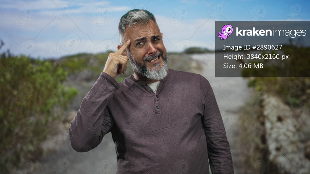 Man points finger to temple, bearded middle age, standing on a forest path beside green shrubs; thinking confused.