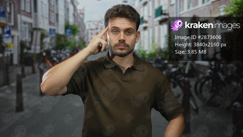 Man points finger to temple on a cobbled street lined with bicycles and brick buildings; thoughtful reflection.