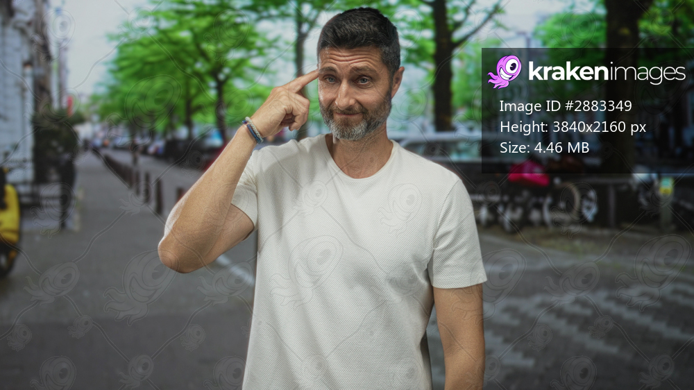 Man points finger to temple on a leafy city street, wearing white tee, subtle smirk and closed eyes, standing by parked bicycles and trees; amused.
