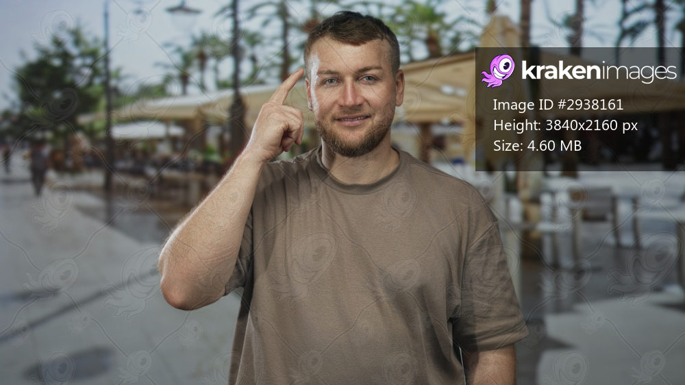 Man points finger to temple on street terrace by outdoor restaurant with umbrellas and tables; thoughtful idea.