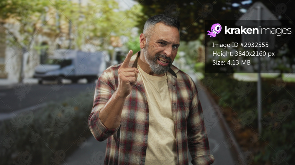 Man points finger to temple on street wearing plaid shirt and beard, grimacing with raised brow and clenched jaw; anger.