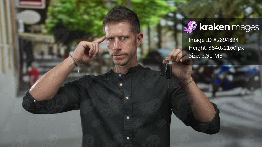 Man points finger to temple while holding car keys on street with parked scooters and trees; hesitation decision.