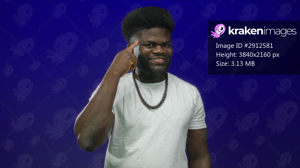 Man points finger to temple while smiling, wearing white t shirt and beaded necklace in blue studio; confidence creativity.