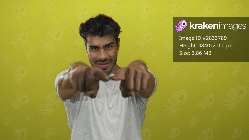 Man points finger to viewer in yellow studio environment, gesturing directly toward camera; confidence connection engagement.