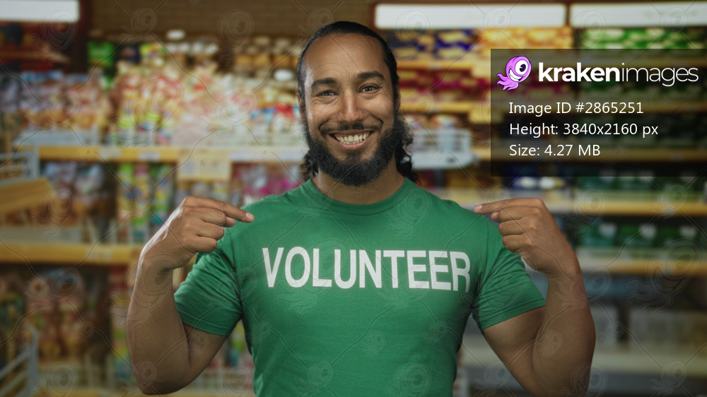 Man points finger to volunteer shirt in store building, bearded and smiling broadly; community service pride.