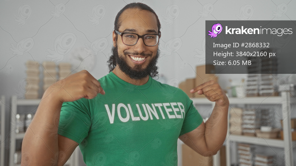 Man points finger to volunteer shirt and smiles with folded arms among packed shelves in a donation center building; community service pride.