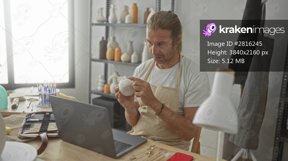 Man points finger to white ceramic vase in studio workshop showing handmade piece wearing apron demonstrating technique; inspiration craftsmanship.