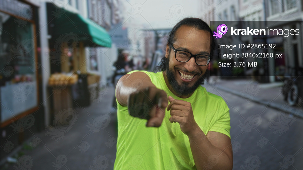 Man points finger toward camera on busy city street smiling broadly wearing neon green tshirt and glasses; joy connection candid moment.