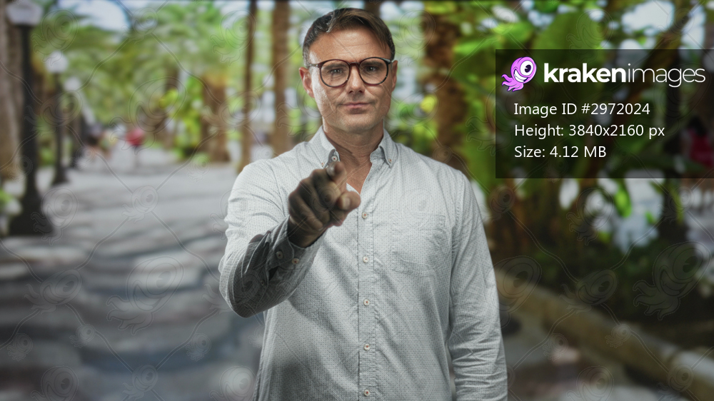 Man points finger toward camera on palm lined street walkway, wearing glasses and a button shirt in daylight; confidence invitation.