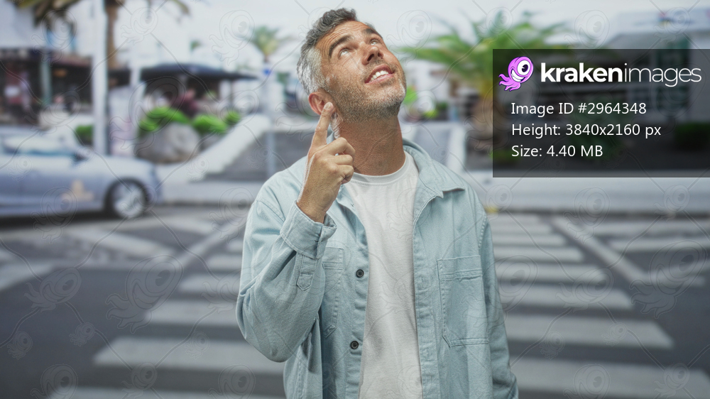 Man points finger up on a street crosswalk near a parked car and palm tree while looking upward and smiling; curiosity contemplation.