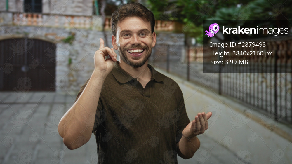 Man points finger up on a sunlit street beside a stone gate and iron fence, smiling with open palm; optimism happiness friendly.