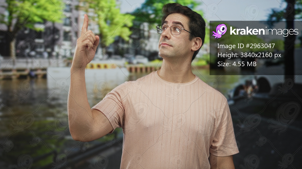 Man points finger up then gives thumbs down on a canal street wearing glasses and a neutral to disappointed expression; disappointment.
