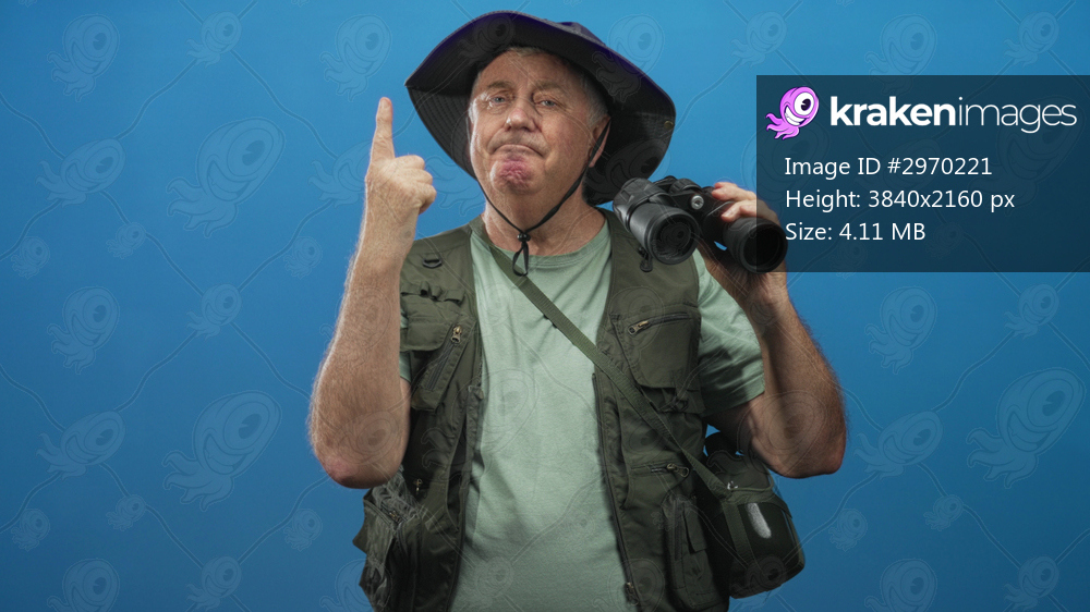 Man points finger up while holding binoculars and wearing explorer vest and hat in studio; curiosity exploration discovery investigation.
