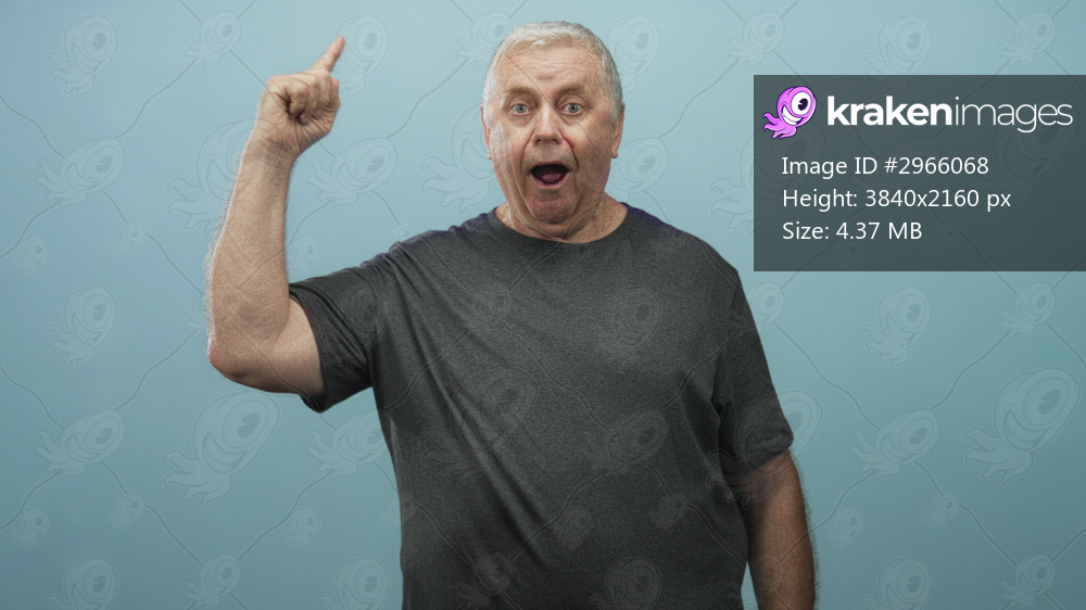 Man points finger upward after hand on chin in studio with open mouth and surprised expression; curiosity surprise insight.