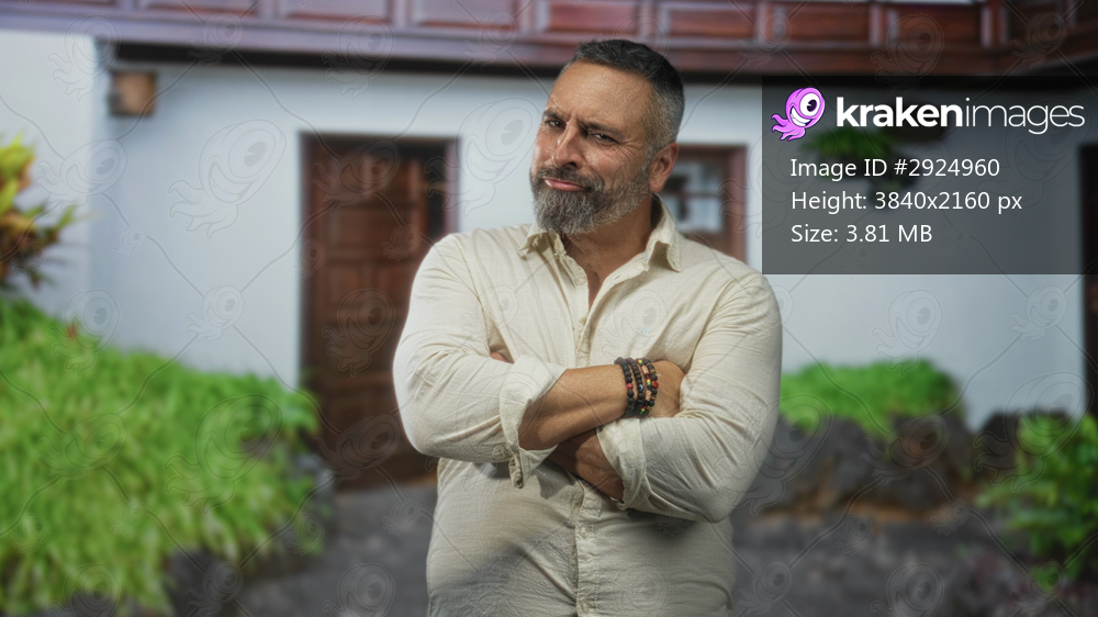 Man points finger upward near building entrance showing hand gesture and beard; confidence authority.