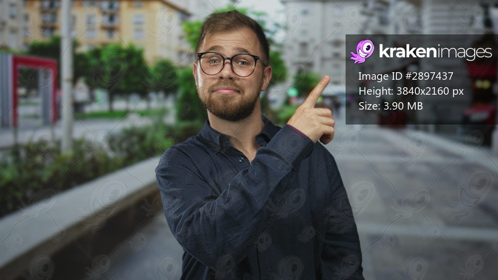 Man points finger upward on city street, wearing glasses and navy shirt, slight smile and raised eyebrow toward nearby building; amused curiosity.