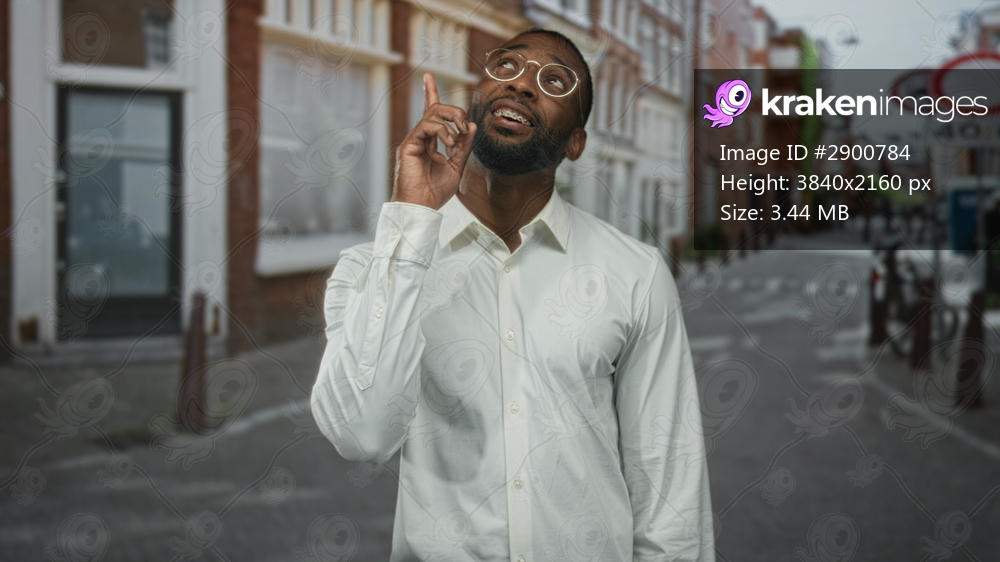 Man points finger upward with visible hand and smiling face on street in city wearing white shirt and glasses; confidence idea.