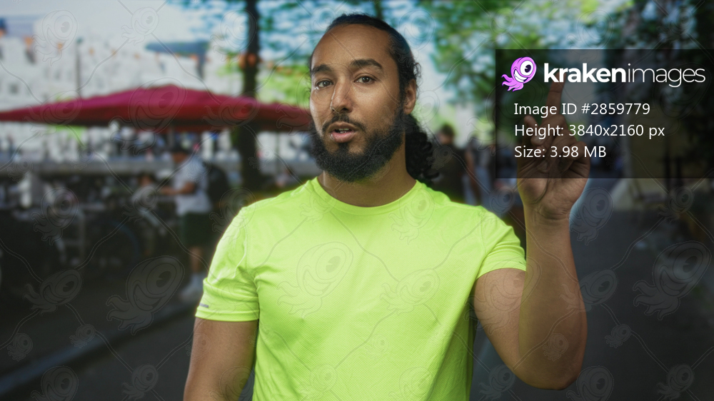 Man points finger upward while speaking at an outdoor restaurant terrace on a busy street; confidence instruction.