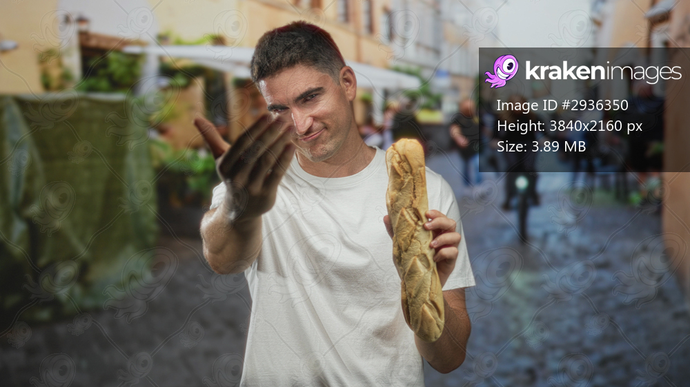 Man points finger while holding a baguette on a cobbled street, smiling and beckoning; playful invitation.
