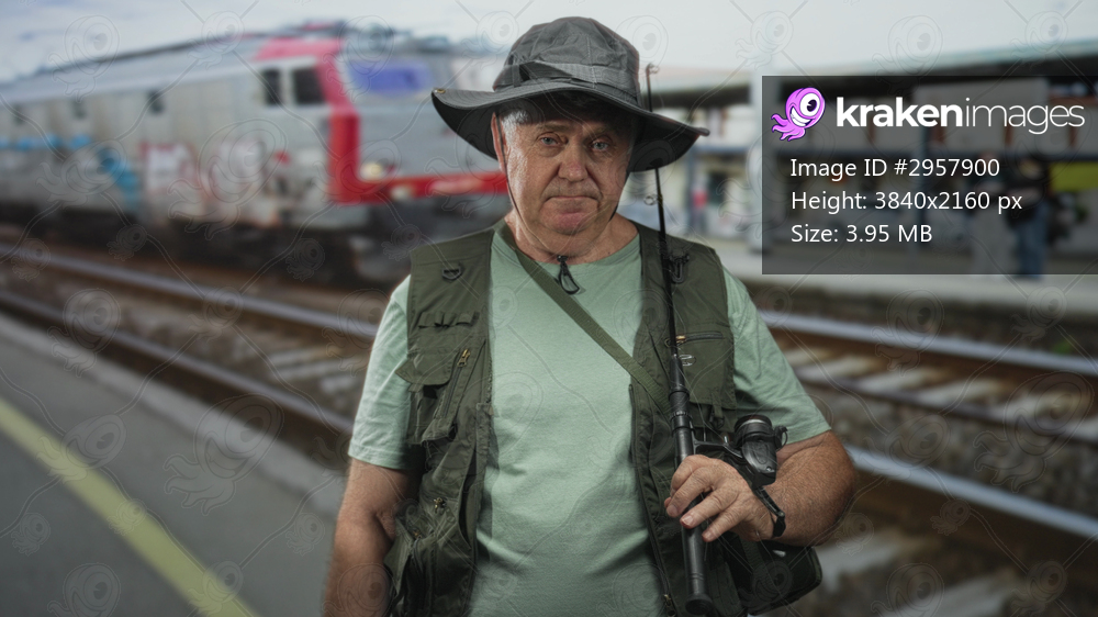 Man points finger while holding a fishing rod and reel on a train station platform; vigilance experience.