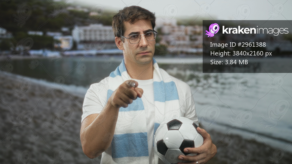Man points finger while holding soccer ball on beach wearing blue and white striped scarf and glasses; fan support determination.