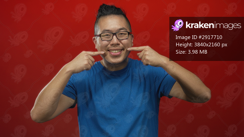 Man points fingers to cheeks while smiling with teeth, wearing glasses and blue t shirt in red studio; playful joy.