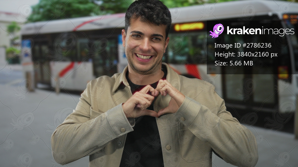 Man points hand at street corner where young hispanic individual makes heart gesture by bus on road.