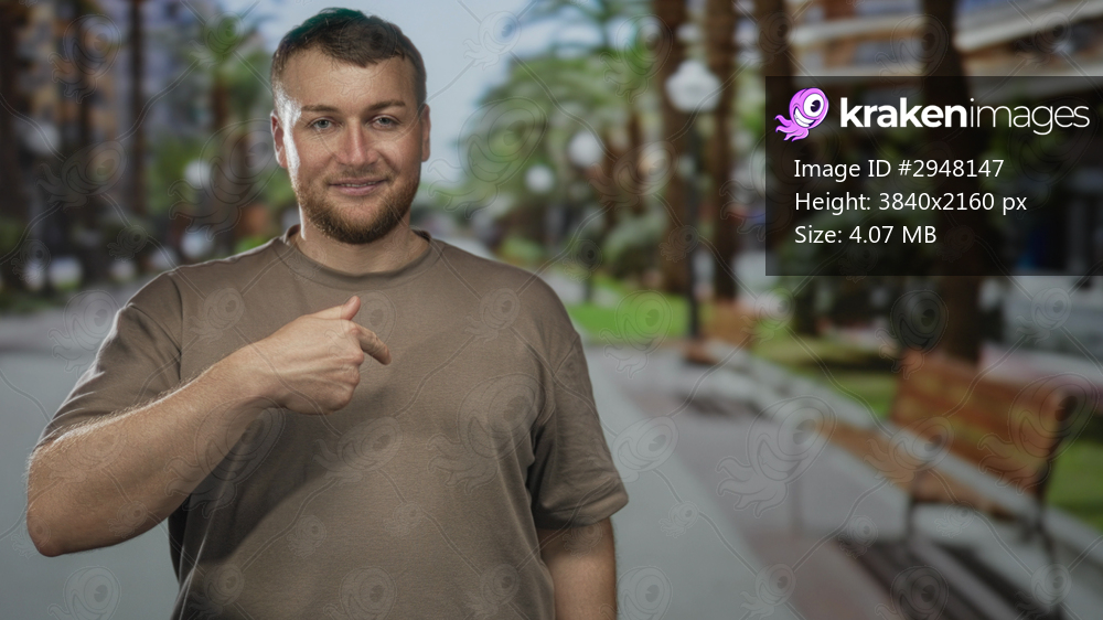 Man points hand to chest on street promenade with benches and palm trees in casual t shirt, forearm visible; pride self confidence identity.
